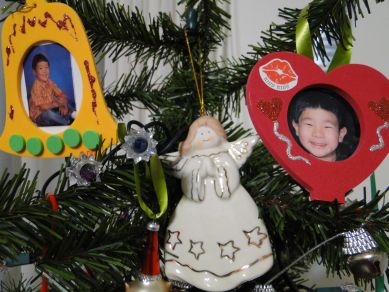 由於年初搬家時間實在太匆忙,空間又不夠,許多美國老家耶誕樹上的燈飾都不能帶回來。儘管如此,還是努力包了一小部分值得紀念的飾品:小熊們在幼稚園作的手工相片吊飾、小熊老友 Trent送的手做陶瓷星星、熊媽烹飪班老師Judy送的小陶瓷天使…當我們一個個珍惜的掛在樹上時,許多塵封的回憶,突然如潮水般湧上心頭...